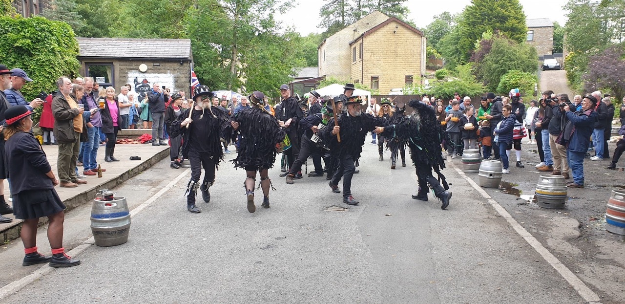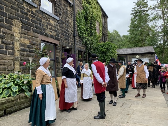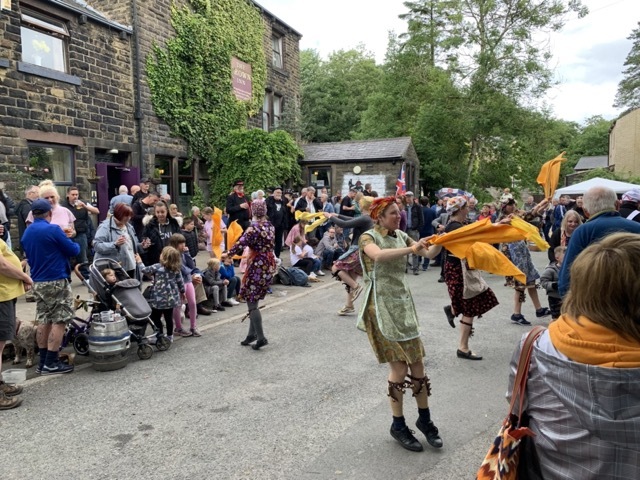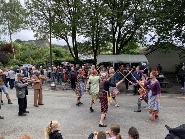 Galliard English Folk Dancers performed in Country costume at The Crown Affair, Bacup in July 2023. A day of celebration of English culture led by The Bacup Britannia Coconut Dancers in their distinctive costumes, supported and encouraged by dance groups each with their own unique costume and dance style. Dancing began at midday and continued all afternoon with crowds swelling as the day progressed.